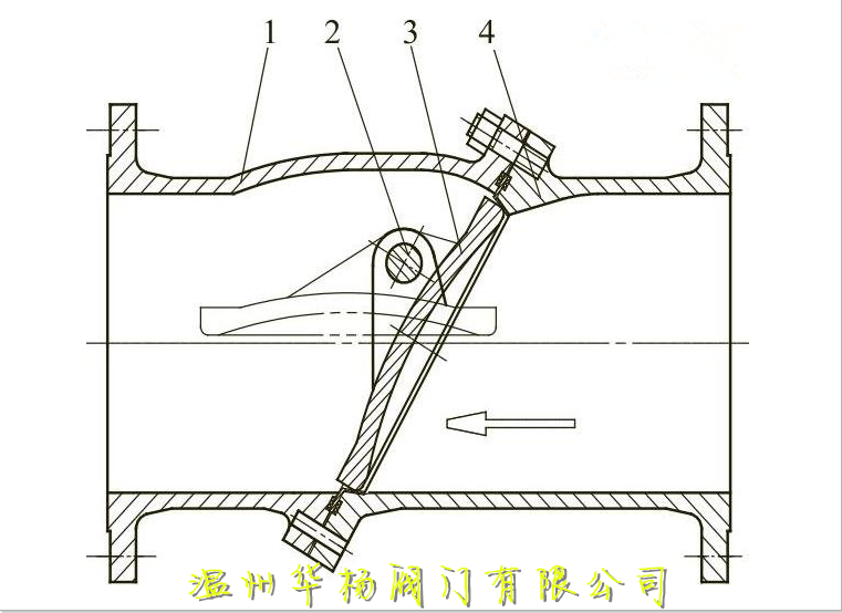 斜盤(pán)式止回閥有一種網(wǎng)盤(pán)式的關(guān)閉件,閥瓣繞搖桿軸旋轉(zhuǎn),并與閥座面偏置。閥瓣轉(zhuǎn)下與閥座密合時(shí)關(guān)閉,開(kāi)啟時(shí)閥瓣從閥座上升起。由于整個(gè)閥瓣的重心移動(dòng)軌跡只在全開(kāi)與關(guān)閉位置之間,行程很短,所以斜盤(pán)止同閥的關(guān)閉很快。圖1所示是斜盤(pán)式止同閥的一種。